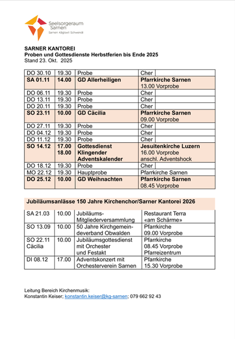 Möchtest du gerne in der SARNER KANTOREI mitsingen oder zunächst einmal schnuppern? JEDE STIMME ist herzlich WILLKOMMEN! Wir proben wöchentlich am Donnerstag von 19.30 bis 21.30 Uhr im Probesaal 1 der Musikschule Sarnen in der Aula CHER.